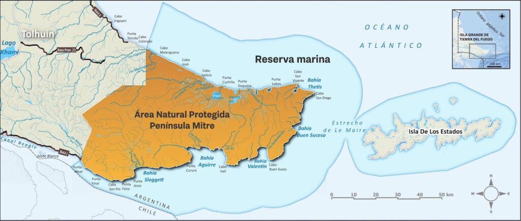 Ubicada en el sector sudoriental de la Isla Grande de Tierra del Fuego, Península Mitre representa un reservorio de enorme valor ecológico e histórico. Su paisaje, moldeado por fuertes vientos y un clima implacable, combina turbales milenarios, densos bosques de lenga, costas acantiladas y una vasta estepa.